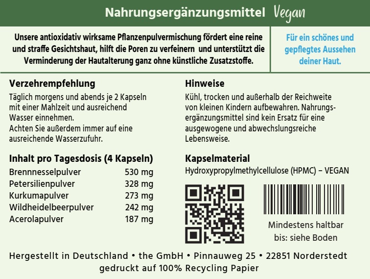 Wir cremen oder ölen täglich unsere Haut ein, damit unser Teint jung, frisch und rein aussieht. Dabei vernachlässigen wir die Tatsache, dass das Aussehen unserer Haut auch von unserer Ernährung abhängt. Denn ein Vitamin- und Mineralstoffmangel macht sich oft im Hautbild bemerkbar. Unser Wirkstoffkomplex ist für den alltäglichen Nährstoffbedarf der Haut ausgerichtet und hilft Dir, Deine Haut von innen heraus zu stärken.